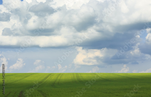© nataba, Fototapeta premium the natural backdrop of blue sky and green fields covered with grass