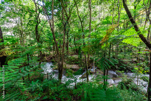 © bangprik, Obraz premium The natural background of the road surrounded by nature, big trees, waterfalls from high mountains and clear sky throughout the adventure journey.
