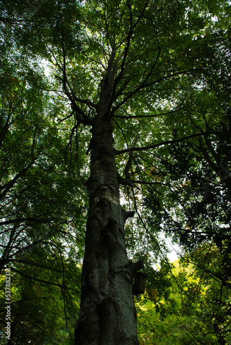 Naklejka premium The natural landscape of the surrounding lush vegetation. Backlit beech...