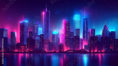 © Ardhana, Fototapeta premium The Neon City Skyline Reflecting Bright Colors on the Water