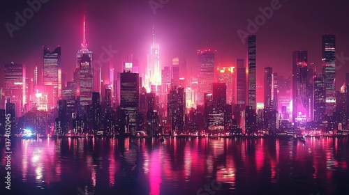 © Bundi, Fototapeta premium The neon portrayal of a cityscape envisioning a futuristic urban world is characterized by illuminated skyscrapers and dynamic light displays