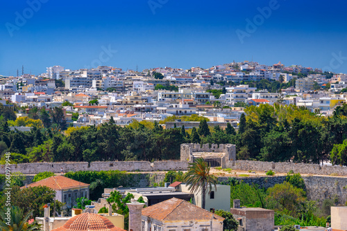 Obraz premium The new city of Rhodes, with luxurious houses, developed on the hills above the old city and outside the ancient stone defensive walls, also near the Acropolis. Popular summer holiday destination.