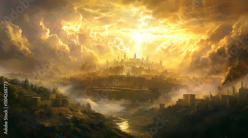 © Thiago, Fototapeta premium The new jerusalem: the city of god descending from heaven - picture a scene where the new jerusalem descends from heaven, a city of pure gold, shining with the glory of god. Transcendent. Illustration