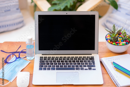 Fototapeta premium The new normal due to coronavirus, work from home using internet connection - with face mask and disinfectant
