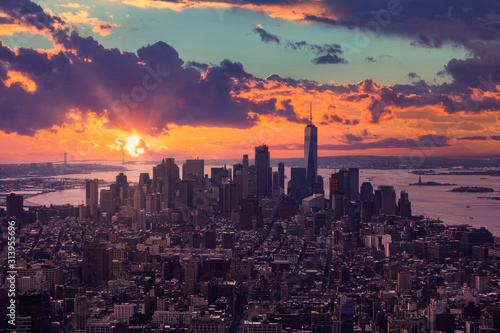 © bluebeat76, Fototapeta premium The New York City USA .Manhattan downtown and New Jersey skyline skyscrapers at sunset. Extreme Panorama