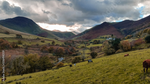 © 365_visuals, Naklejka premium The Newlands Pass scenic valley in autumn with snow capped mountains. Popular destination in the Lake District, Cumbria, United Kingdom.