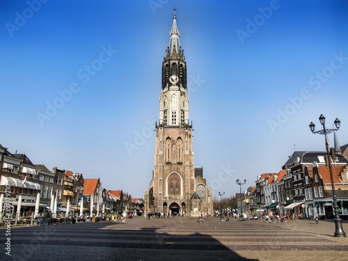 Fototapeta premium The Nieuwe Kerk - New Church. Protestant church in the city of Delft in the Holland. The building is located on Delft Market Square - Markt. Cloudless blue sky and people walking around.