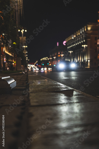 © Davyd Varabyou, Fototapeta premium The night city of Minsk. Cars in the distance are driving along the avenue