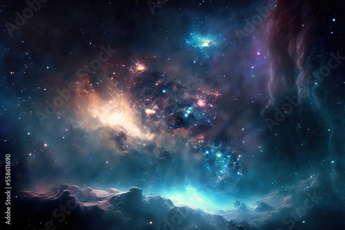 © The 2R Artificiality, Naklejka premium The night sky beyond space wallpaper is a computer generated image of a star field on a nebula. Generative AI