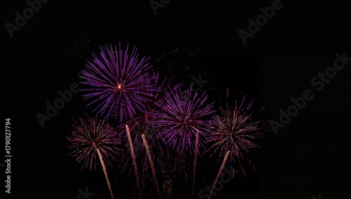 Fototapeta premium The night sky illuminated with vibrant purple fireworks, creating a festive...