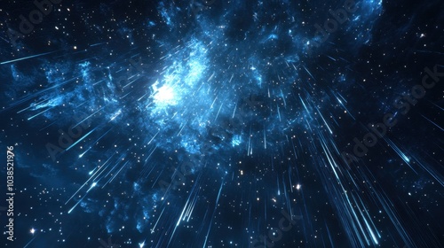 Naklejka premium The night sky with a meteor shower, streaks of light passing through a star-filled galaxy.