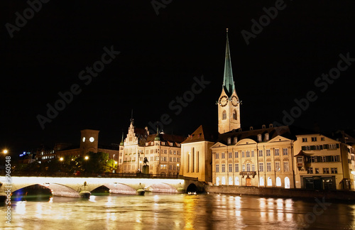 © Gary, Naklejka premium The night view of the Fraumunster church in Zurich Switzerland