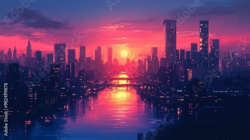 Fototapeta premium The nighttime city skyline showcases illuminated skyscrapers and bustling...