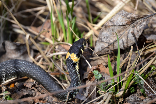 © Aleksandr, Obraz premium The non-poisonous snake in the grass close up