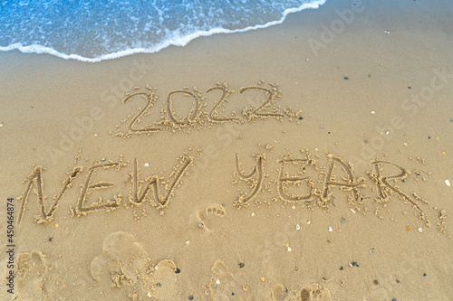 Fototapeta premium The numbers 2022 are written on a sandy seashell beach. Wave and surf. Summer...