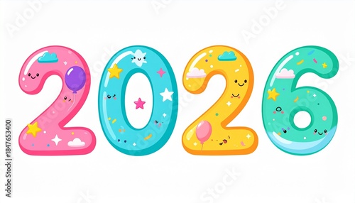 Fototapeta premium The numbers “2 0 2 6” designed in a bright, playful kids theme with rounded,...