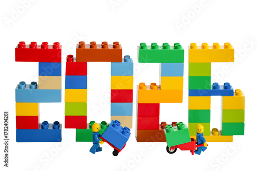 © Юлия Васильева, Naklejka premium The numbers 2026 made from different colored Lego bricks and workers on a white background.