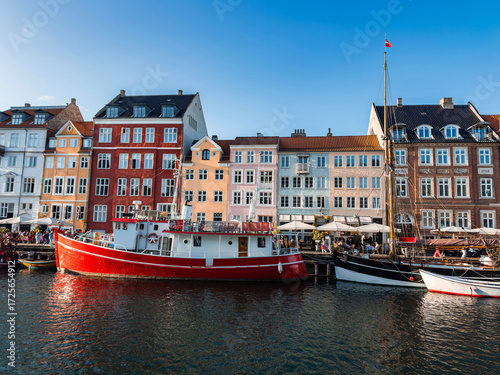 © Aerial Film Studio, Fototapeta premium The Nyhavn district in Copenhagen, Denmark, features colorful historic buildings, a red boat in the canal, smaller vessels, and outdoor cafes under a clear sky.