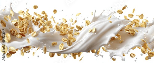 © Marta B, Naklejka premium The Oats and Milk Splash With Flying Cereal Flakes on White Background