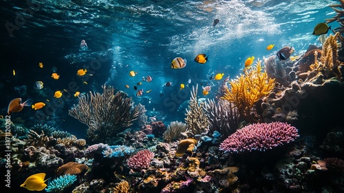 Naklejka premium The ocean floor is full of life! Colorful corals and many sea creatures live...
