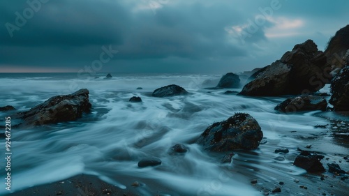 © Prompt2image, Obraz premium The ocean's waves cascade over dark rocks as clouds gather, creating a serene yet dramatic atmosphere at dusk