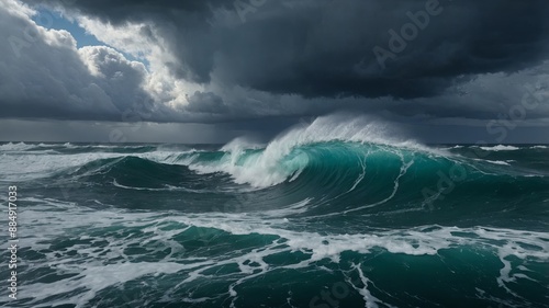 Fototapeta premium The ocean with stormy clouds and churning waves.