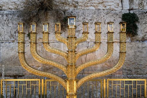Naklejka premium The official Hanukkah menorah of the Western Wall in Jerusalem, burning during the eight-day Festival of Lights in Israel. .