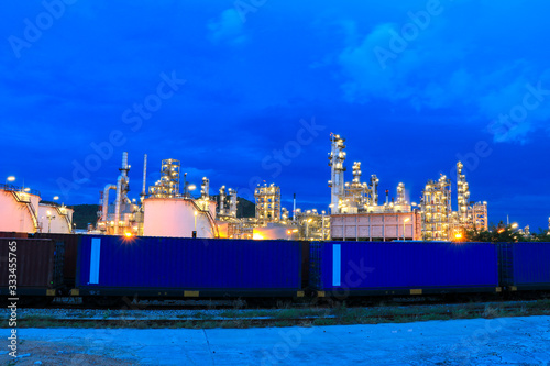 © Rangsarit, Naklejka premium The oil refinery industry, petroleum, petrochemical plants full of technology. And the blue background, orange lights