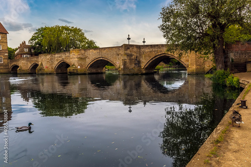 Fototapeta premium The old bridge at Riverside, Godmanchester reflected in the River Great Ouse...