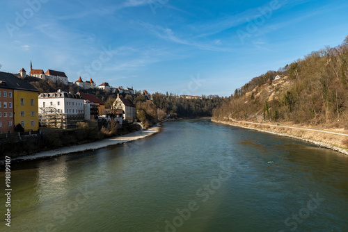 © Deniz, Obraz premium The old houses of Burghausen with the river Salzach
