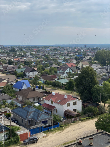 © Olga, Obraz premium the old part of the city of Belarus, aerial view, summer 2022. Roofs of houses, construction, landscaping of the city, clean air