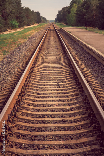 Obraz premium The old railway sleepers and rails extending into the distance