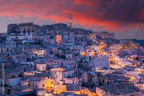 © Igas Studios , Obraz premium The old town of Matera, Basilicata, Southern Italy during a beautiful sunset.(Sassi di Matera)blue hour and city lights