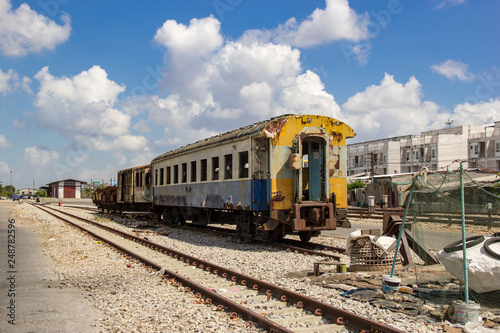 Fototapeta premium The old train carriages were not in use, parked on the tracks inside the...