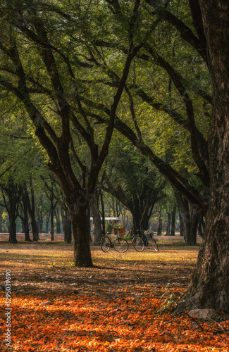 © Peerawat, Obraz premium The orange flower on floor with a big tree on Thailand