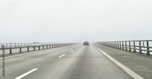 Naklejka premium The Oresund bridge over the sea connecting Sweden and Denmark is lost in the fog