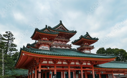 Naklejka premium The ornate, multi-tiered roof of Heian Shrine displays intricate traditional Japanese architectural details, with its vibrant red and green colors highlighting the fine craftsmanship in Kyoto, Japan.