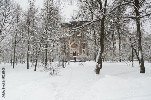 © Julia, Fototapeta premium The Orthodox Church, the Moscow State United Historical and Architectural and Natural Landscape Museum-Reserve, Izmaylovo Estate, a gloomy winter day, white snow, bare trees.