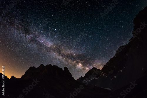 Naklejka premium The outstanding beauty of the Milky Way arc and the starry sky captured at high altitude in summertime on the Italian Alps, Torino Province. Fisheye scenic distortion and 180 degree view.