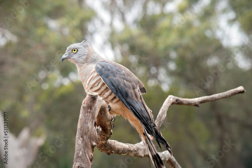 Fototapeta premium the Pacific baza has a grey face with yellow eyes white and brown striped chest and drak grey wings