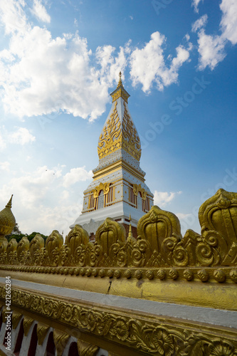 Naklejka premium The Pagoda of Wat Phra That Panom temple in Nakhon Phanom, Thailand in cloudy blue sky day with sunlight