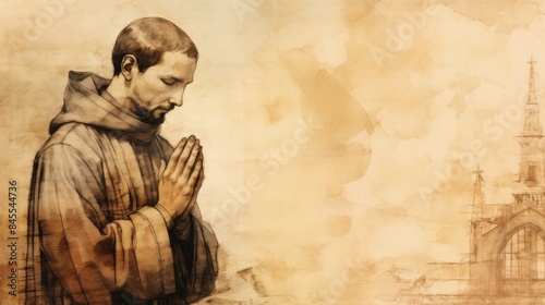 © T Studio, Fototapeta premium The painting of St. Cajetan in Prayer in 16th-Century Italian Church, Beige Background, Copyspace,Christian banner