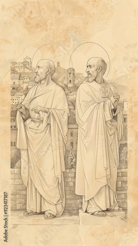 © T Studio, Fototapeta premium The painting of St. Cosmas and Damian Practicing Medicine in 3rd-Century Roman Village, Biblical Illustration, Beige Background, Copyspace