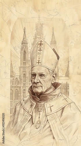 Fototapeta premium The painting of St. Hugh of Lincoln in Bishop's Robes, 12th-Century English Cathedral, Biblical Illustration, Beige Background, Copyspace