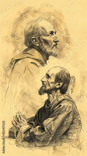 © T Studio, Fototapeta premium The painting of St. Ignatius of Loyola in Prayer, Vision of Christ, Biblical Illustration, Beige Background, Copyspace