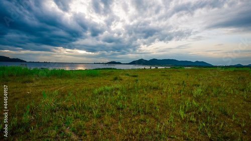 © bangprik, Fototapeta premium The panoramic natural background of the atmosphere at the natural reservoir scenic area at various tourist attractions, allowing tourists to stop and take pictures during the trip.