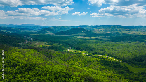 Fototapeta premium The Parenzana is a beautiful old railway route in Istria, Croatia, which has been transformed into a scenic bicycle path. Captured by drone, the Parenzana reveals its charming countryside charm