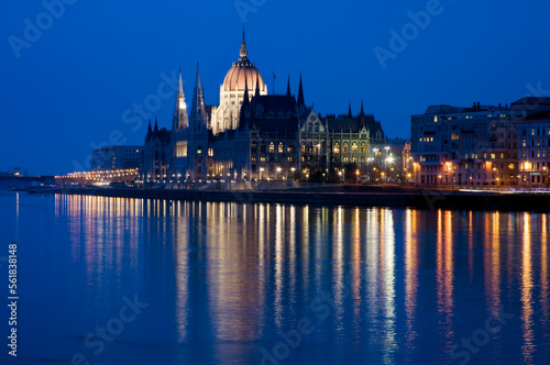 Obraz premium the Parliament Building at night, Budapest, Hungary, with lights reflected in...