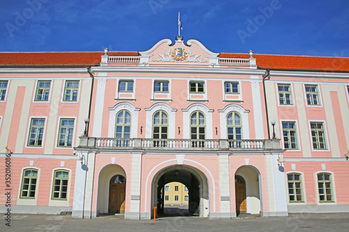 © lisastrachan, Obraz premium The Parliament of Estonia building on Toompea hill in the central part of the old town, Tallinn, the capital of Estonia. It is dated from the 9th century.