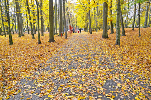 © vodolej, Obraz premium The path in the park, dotted with yellow leaves. Fall